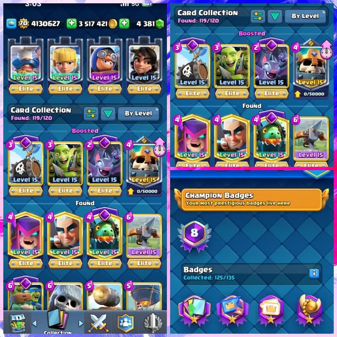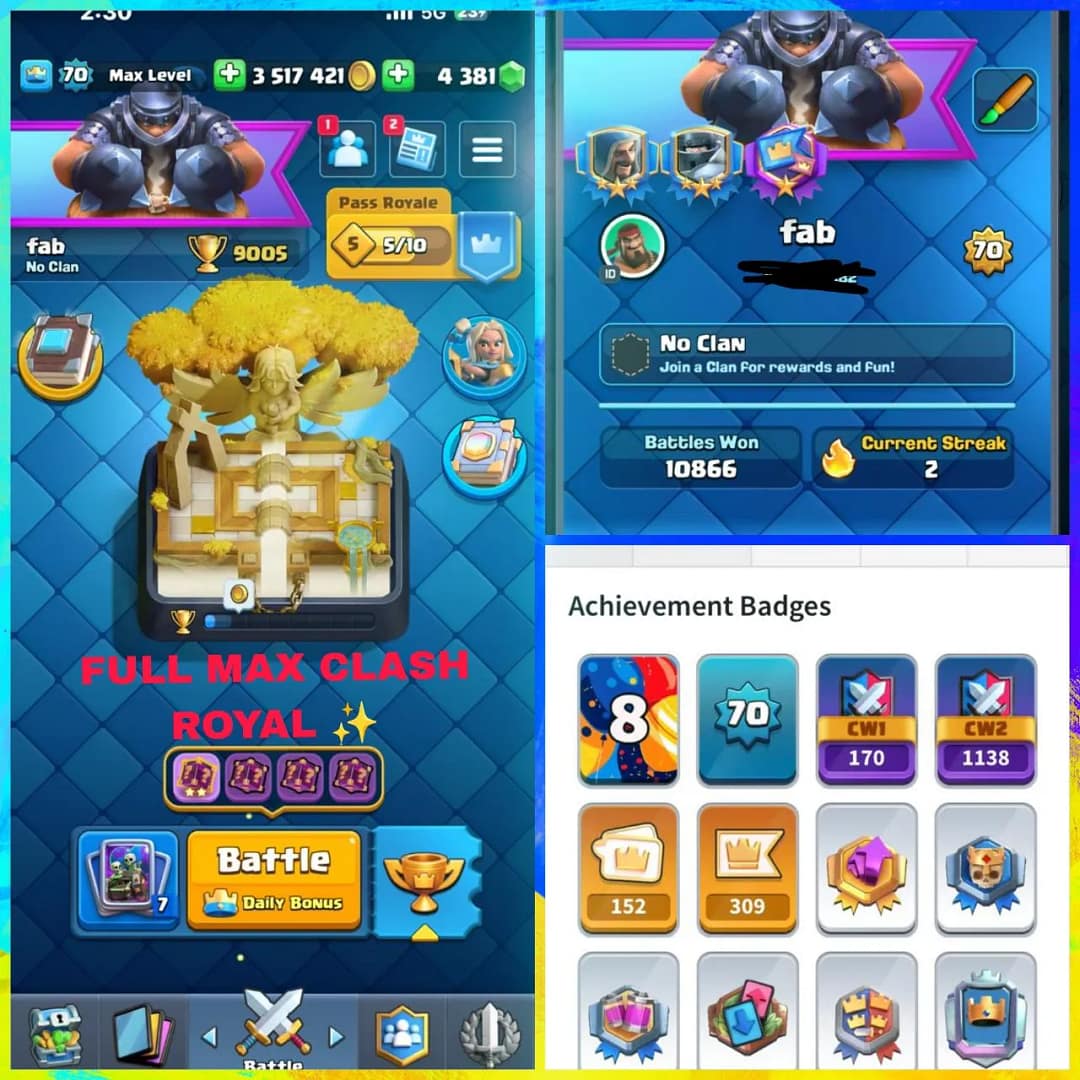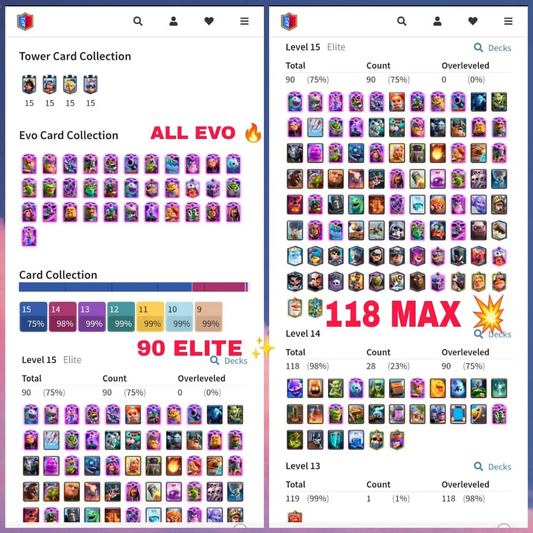 ✨ MAX CR ACCOUNT ✨70 EXP[ MAX ] ✨ ALL EVO CARD ✨ [ 90 ] ELITE CARD ✨ [ 118 ] MAX CARD ✨ 9000 TROPHY ✨ ARENA 23 ✨ KT 15 ✨ 73 KT SKINS✨ 3.5M GOLD ✨ [ 158 ] DECORATION ✨ [ 151 ] FRAMES ✨ 125 BADGES ✨ [ 153 ] EMOTES ✨