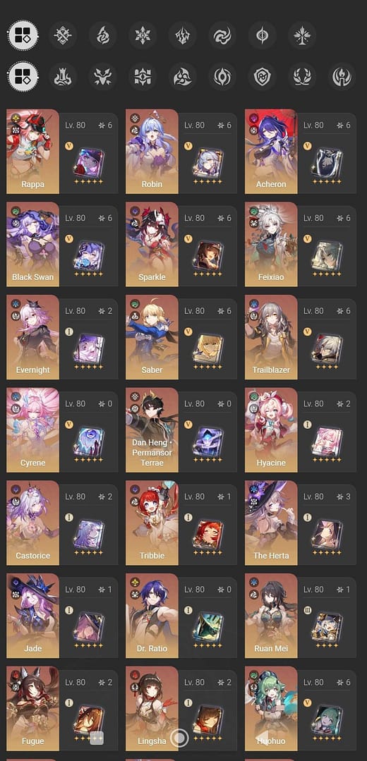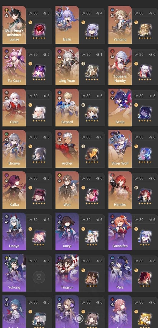 E6S5:Saber+SilverWolf+Sparkle+Robin+Topaz&Numby+Huohuo+Acheron+Kafka+Black Swan+Feixiao+Fu Xuan+Seele+Rappa+almost all the regular warp charactors(Bailu E4)